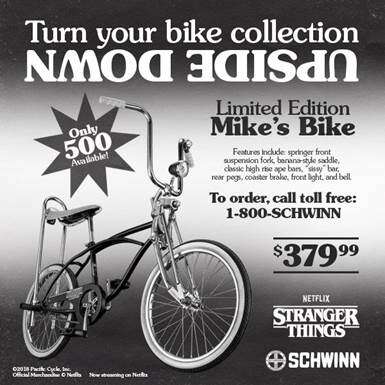 Starting monday, june 4, schwinn is offering 500 replicas of the bike owned by mike wheeler (finn wolfhard) on netflix's stranger things. The bikes featured in stranger things have almost become their own characters, says milissa rick, senior director of marketing, schwinn. They are making 500 of these and they will be sold on june 4, 2018. Schwinn stranger things mike's bike. It also comes with a bunch of stranger things easter eggs, like a hawkins bike registration sticker on the seat.